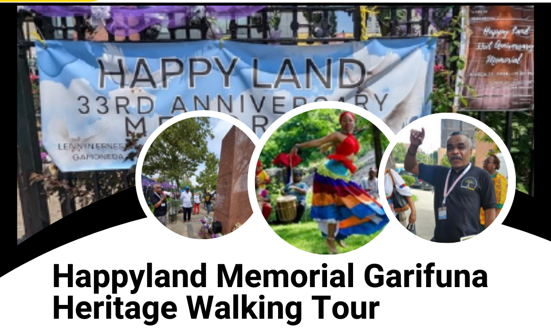 - Historical Walking Tour: El domingo 6 de abril, a las 11:00 a. m., la Sociedad Histórica del Condado del Bronx y la Coalición Garifuna organizarán un recorrido a pie al Monumento Happy Land , trazando la historia y la resiliencia de la comunidad.