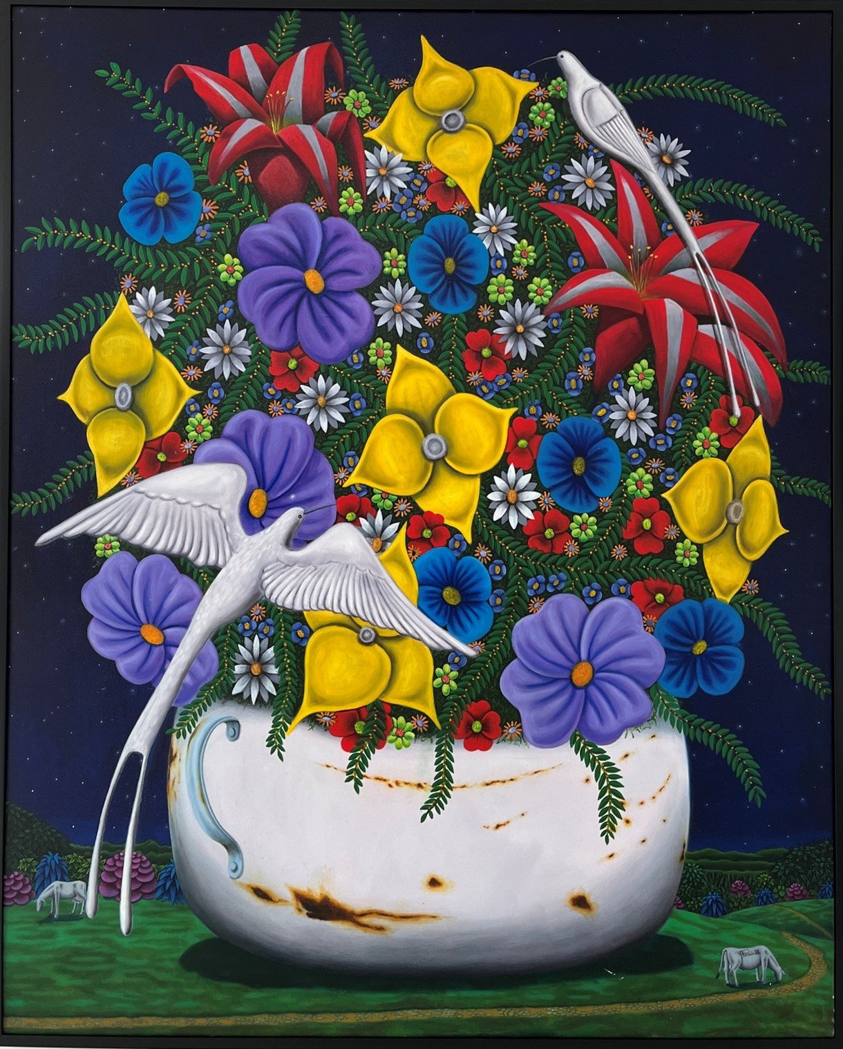 En esta última obra, podemos verificar y disfrutar de su estilo Naif. El cuadro es de un colorido muy atractivo y representa a dos picaflores deleitándose al beber el néctar de diversas flores ubicadas en un oxidado e improvisado macetero metálico.