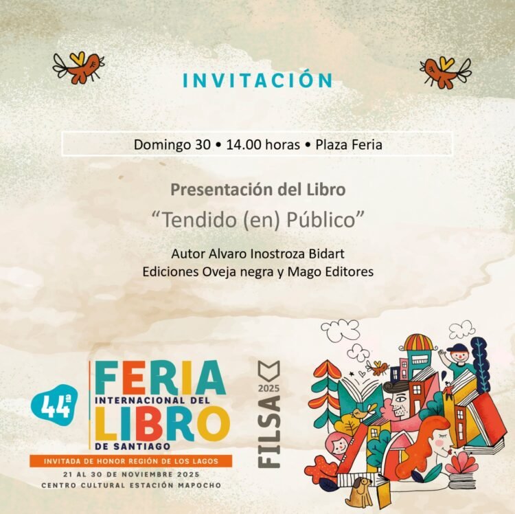 En esta ocasión, quiero compartirles una interesante invitación a la presentación del libro “Tendido (en) Público” del poeta, periodista, gestor cultural y crítico de cine Alvaro Inostroza Bidart. El evento se realizará el próximo domingo 30 de noviembre a las 14:00 horas en la plaza Feria, al interior del Centro Cultural Estación Mapocho, en Santiago de Chile.