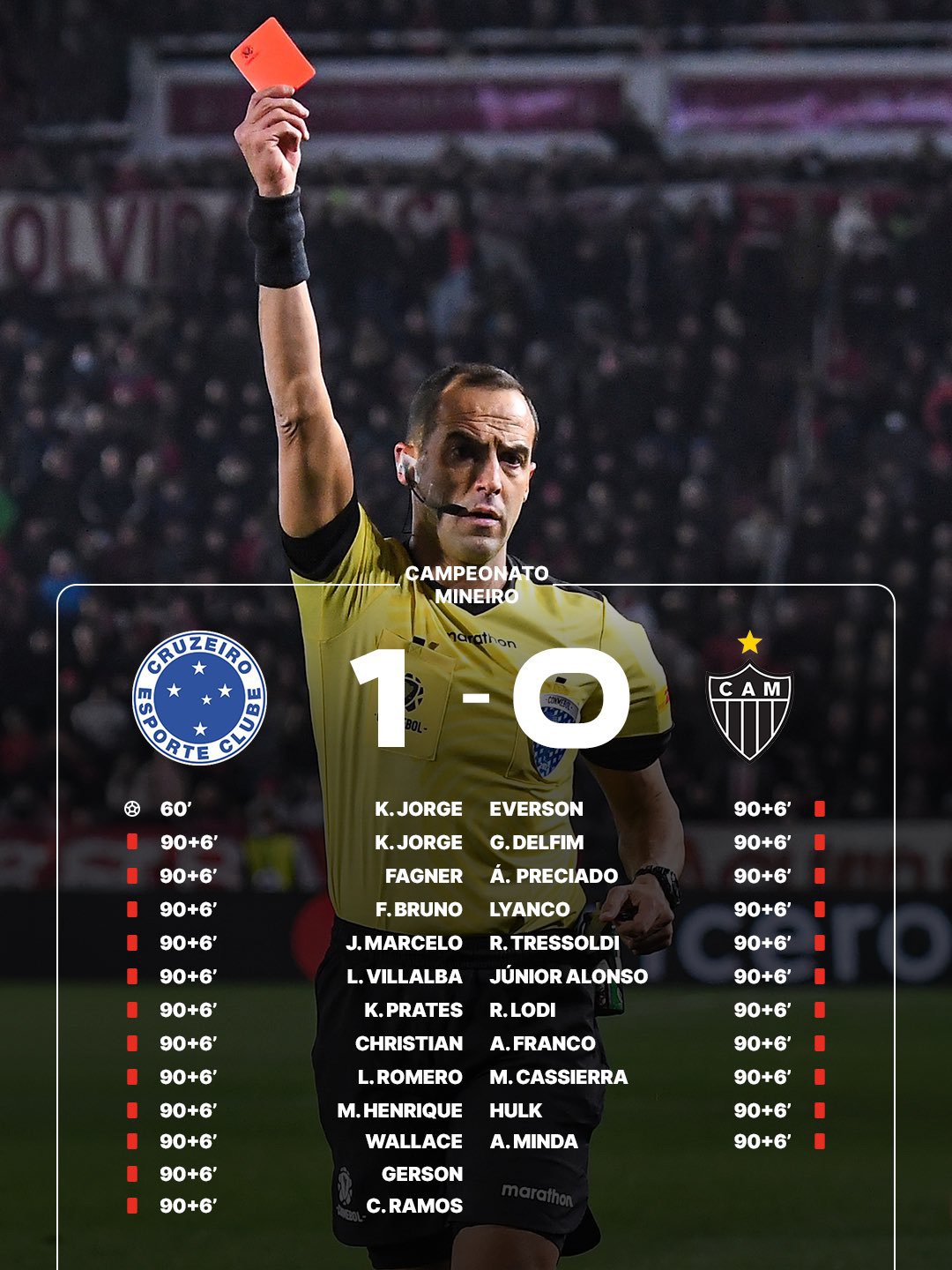 Según los reportes posteriores al encuentro, 12 expulsiones correspondieron a jugadores de Cruzeiro y 11 a Atlético Mineiro, reflejando la magnitud del enfrentamiento entre ambos planteles.