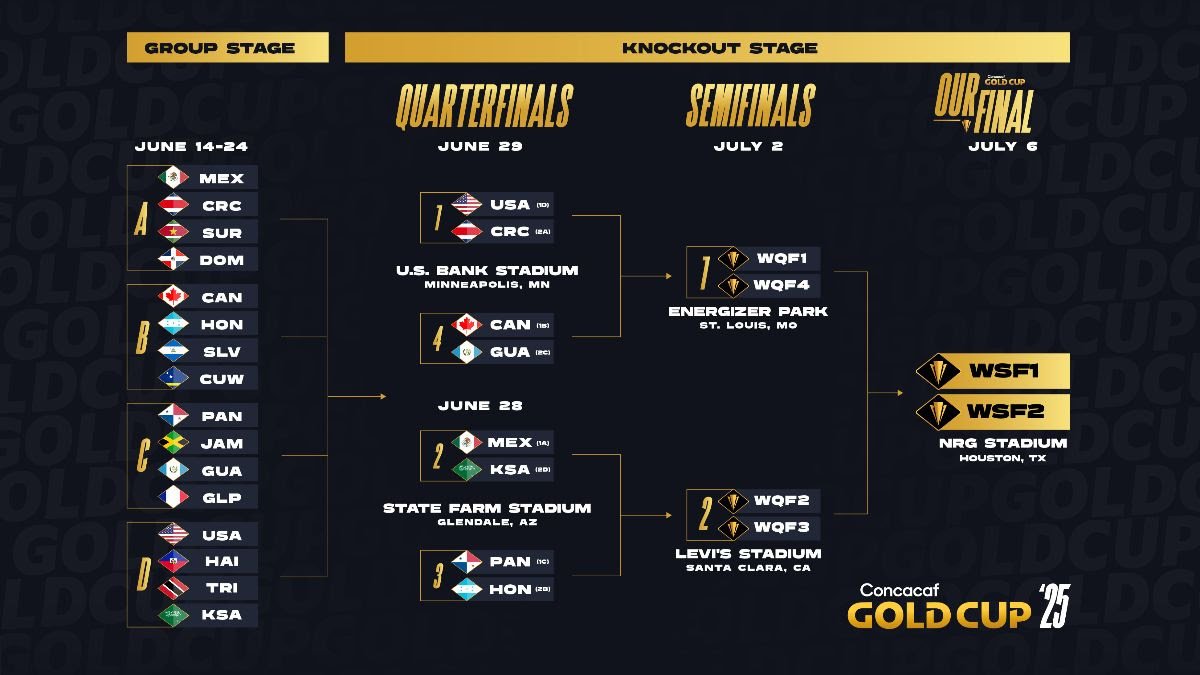 La Fase de Eliminación Directa de la Copa Oro Concacaf 2025 se llevará a cabo entre el 28 de junio y el 6 de julio, comenzando con los Cuartos de Final el 28 y 29 de junio en el State Farm Stadium en Glendale, AZ, y el U.S. Bank Stadium en Minneapolis, MN, respectivamente, seguido por las Semifinales el 2 de julio en Levi’s Stadium en Santa Clara, CA, y Energizer Park en St. Louis, MO, y culminando con la Final el 6 de julio en NRG Stadium en Houston, Texas.