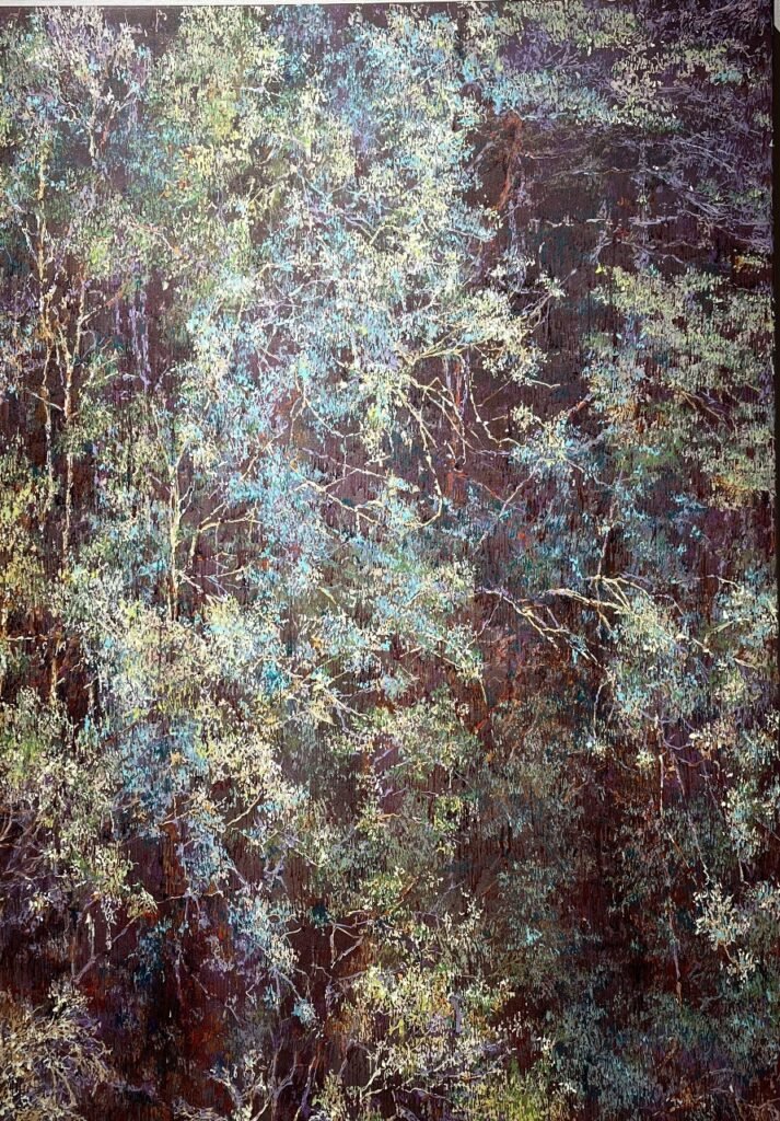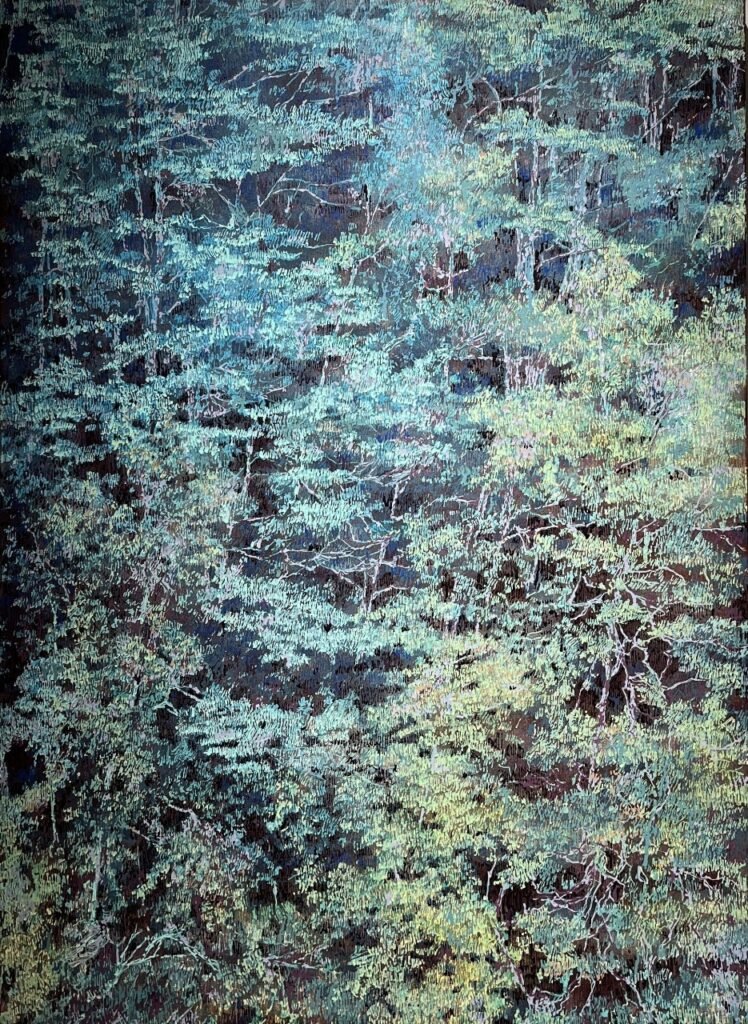 Los paisajes de Catalina Sclabos Boetsch transmiten una conexión con la naturaleza mediante el desarrollo de una técnica que fusiona el dibujo con la pintura. Su detallado trabajo de líneas vibra en la superficie del lienzo, mientras crea profundidad y textura al mismo tiempo. Trazos dinámicos y vaporosos, recorren la tela y susurran poéticamente sobre espacios interiores meditativos.