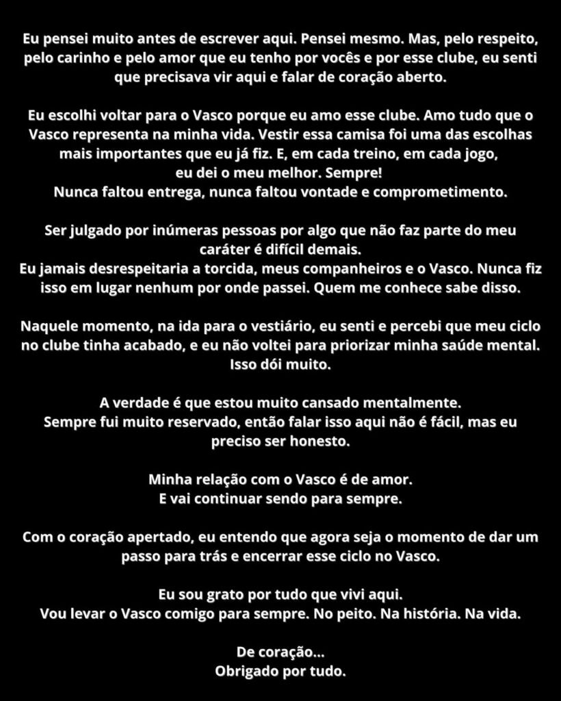 Elegí volver al Vasco porque amo a este club. Amo todo lo que el Vasco representa en mi vida. Vestir esta camiseta fue una de las decisiones más importantes que he tomado. Y en cada entrenamiento, en cada partido, di lo mejor de mí. ¡Siempre!