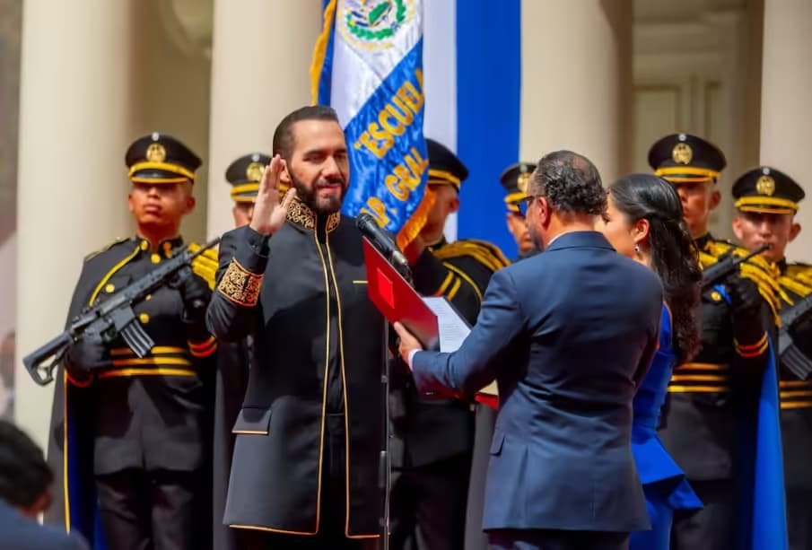 Nayib Bukele ha exhibido este sábado un inmenso poder en su toma de posesión. Después de que el presidente de El Salvador jurara un nuevo mandato con la mano izquierda posada en un ejemplar de la Constitución y se enfundase la banda presidencial, las fuerzas armadas desfilaron a paso firme por la misma alfombra roja que poco antes habían cruzado los reyes y los jefes de Estado extranjeros que acudieron al evento. Bukele hacía el saludo militar con gesto grave desde el balcón del Palacio Nacional, un edificio neoclásico levantado en pleno centro histórico de San Salvador, la capital. Enfrente, le observaba en silencio la estatua ecuestre de bronce del héroe nacional Gerardo Barrios, invadida de palomas. En sus primeras palabras, el mandatario hizo continuas referencias a la gloria de Dios y después aseguró que este es un momento de catarsis para él y para la nación que dirige: “Es el momento más importante de nuestra historia reciente”.