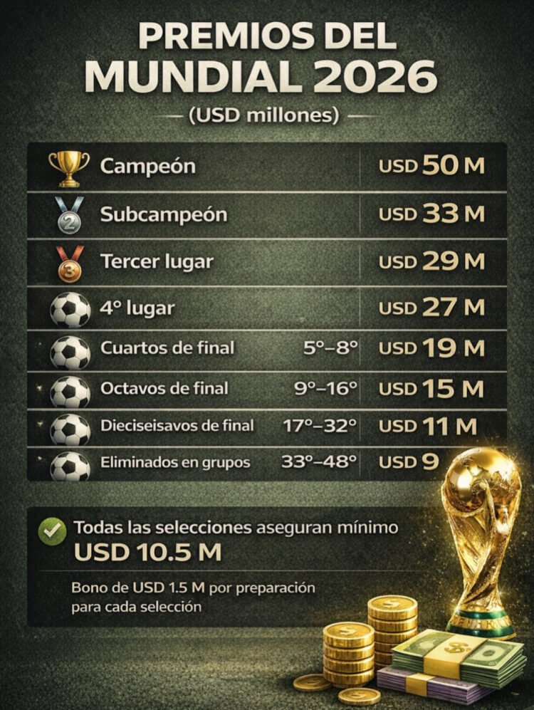 El campeón del Mundial 2026 se llevará un premio de 50 millones de dólares, consolidándose como el torneo con mayor recompensa económica en la historia del fútbol. El subcampeón recibirá 33 millones, mientras que el tercer lugarobtendrá 29 millones. El equipo que finalice en la cuarta posición asegurará 27 millones de dólares.