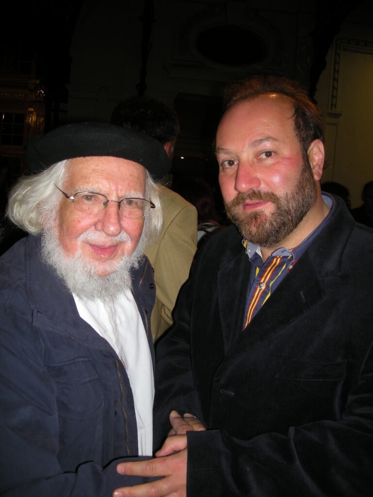 Los poetas Ernesto Cardenal y Theodoro Elssaca, tomados de las manos compartiendo escenario y lectura en Madrid a fines de los años ´90 del milenio en fuga.