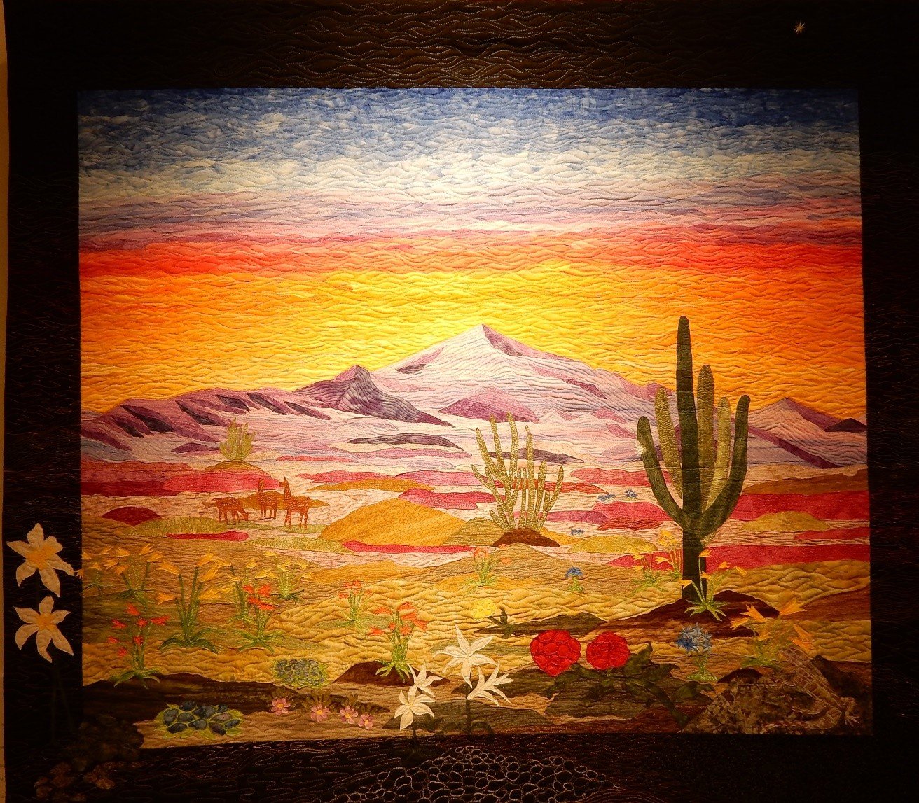 La muestra textil, “Flora, Fauna y Paisaje”, ha sido expuesta durante dos años (mayo 2021 a mayo 2023) en seis galerías en Estados Unidos y también en el Museo de Quilting más importante de ese país: The National Quilt Museum ubicado en Paducah, Kentucky. Realmente llegar allí ha sido y es un honor para nosotras. Hoy tenemos el placer de compartirla con ustedes en Viña del Mar. En diciembre lo haremos en la Casa de la Cultura de Rancagua… y también estuvimos durante dos meses con gran afluencia de público, en el Palacio Schats de Providencia, Santiago, Chile.