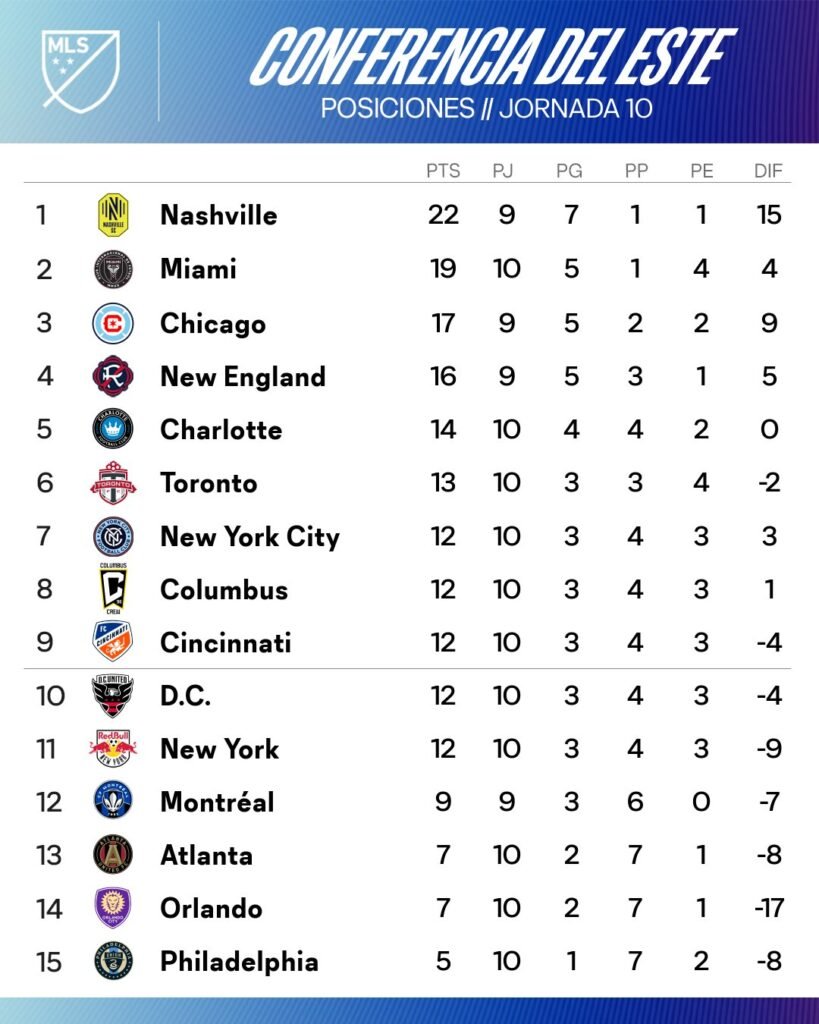 En la Conferencia del Este, Nashville continúa consolidándose como el equipo más sólido del momento. El conjunto amarillo no solo lidera la tabla con 22 puntos en nueve partidos, sino que además presume una impresionante diferencia de gol de +15, reflejo de una escuadra equilibrada, agresiva y con una consistencia que hoy lo convierte en el rival a vencer. Su triunfo por 4-2 en esta jornada fue una nueva demostración de poderío ofensivo y personalidad competitiva. Nashville no solo gana, también convence y manda un mensaje claro al resto de la conferencia: hoy por hoy, el Este les pertenece.