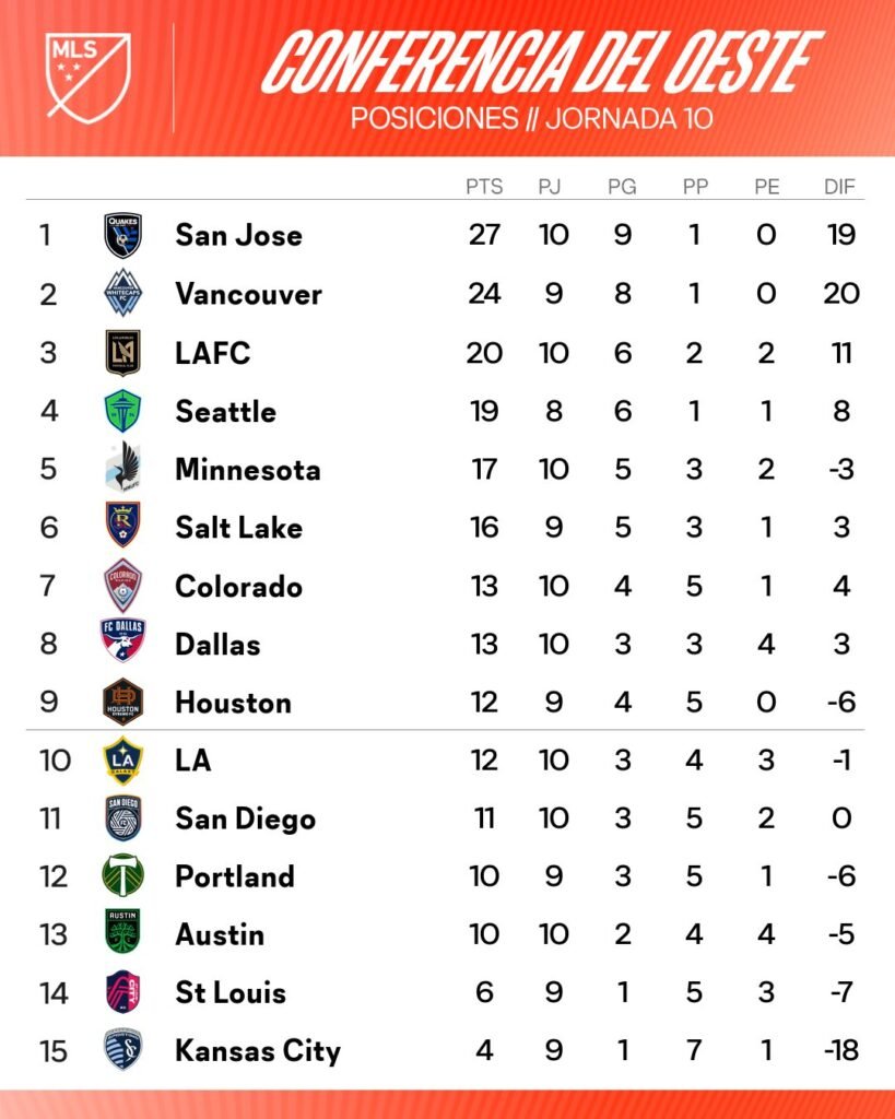 Detrás del líder aparece Vancouver, segundo con 24 puntos y también en un nivel formidable. El equipo canadiense sigue muy de cerca a San Jose y se perfila como su principal perseguidor. Más atrás, LAFC se mantiene tercero con 20 puntos, seguido por Seattle y Minnesota, dos equipos que siguen firmes en la pelea alta.