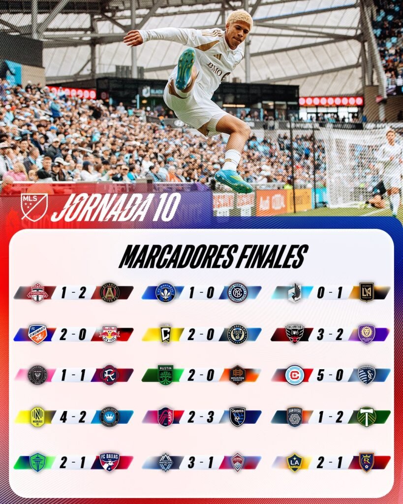 La Jornada 10 también dejó marcadores impactantes que sacudieron la liga. Chicago aplastó 5-0 a Kansas City en una de las goleadas más contundentes del fin de semana, confirmando su gran presente y dejando en evidencia el colapso de su rival. Nashville derrotó 4-2 a Charlotte en un partido lleno de pegada y emociones. Atlanta sorprendió al imponerse 2-1 sobre Toronto. New York City venció 1-0 a Columbus en un duelo muy parejo. Inter Miami cayó 0-1 ante LAFC en uno de los resultados más llamativos de la fecha. Seattle superó 2-1 a Dallas, Vancouver venció 3-1 a Colorado y LA Galaxy derrotó 2-1 a Real Salt Lake.