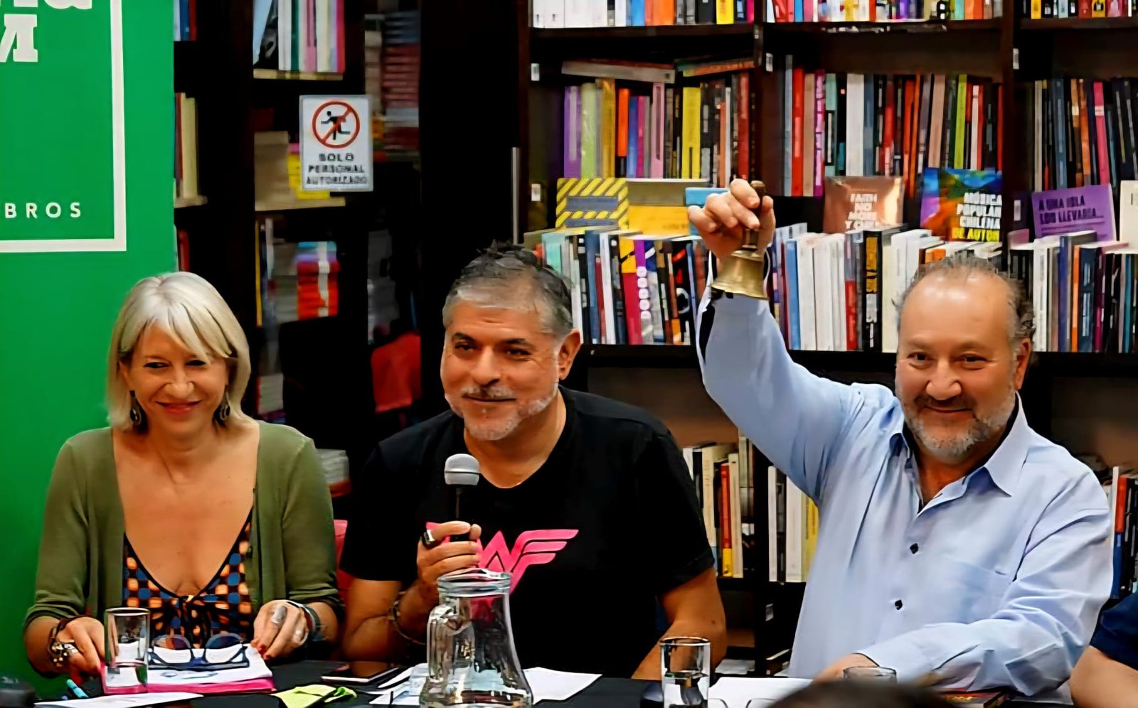 Anna Bou, Ricardo Espinoza Lolas y Theodoro Elssaca, tocando la campana ritual del Manifiesto