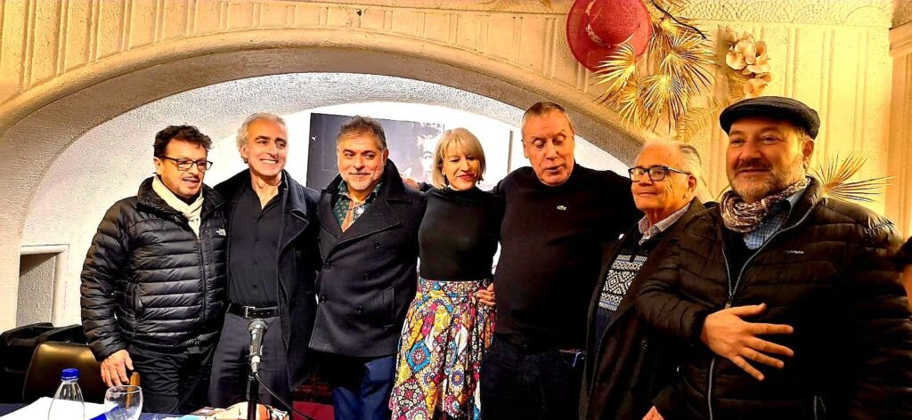Marco Carvacho, Álvaro Valderrama, Ricardo Espinoza Lolas, Anna Bou Jorba, Pedro Sánchez, Edmundo Moure y Theodoro Elssaca, durante una presentación en la legendaria Sociedad de Escritores de Chile, 2025