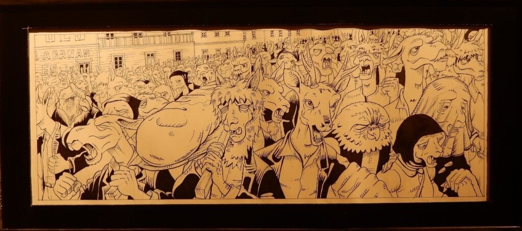 “Si mi novela humanizó una cifra de muertos por la metralla, lo que hizo Pedro Prado (hay que tener poesía con los cojones para llevar ese nombre en Chile) al graficar la historia, al fabularla, al “animalizarla”, fue angelizar un hecho de sangre tan terrible como el de la Escuela Santa María de Iquique. Angelizar el hecho (he aquí su genialidad) sin soslayar el lado humano y sin esquivarle el bulto al lado bestial.