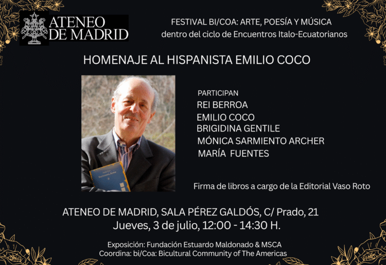 Bajo la coordinación de bi/Coa, se desarrollaran dos actividades, para celebrar un reconocimiento especial en España a uno de los hispanistas más destacados en el mundo hispánico. nos complace compartir nuestro Festival Intercultural BICOA, Arte y Poesía Multilingüe, son parte de una serie de encuentros internacionales ítalo-ecuatoriano. En esta ocasión especial, el Festival está dedicado al hispanista, poeta y traductor Emilio Coco.