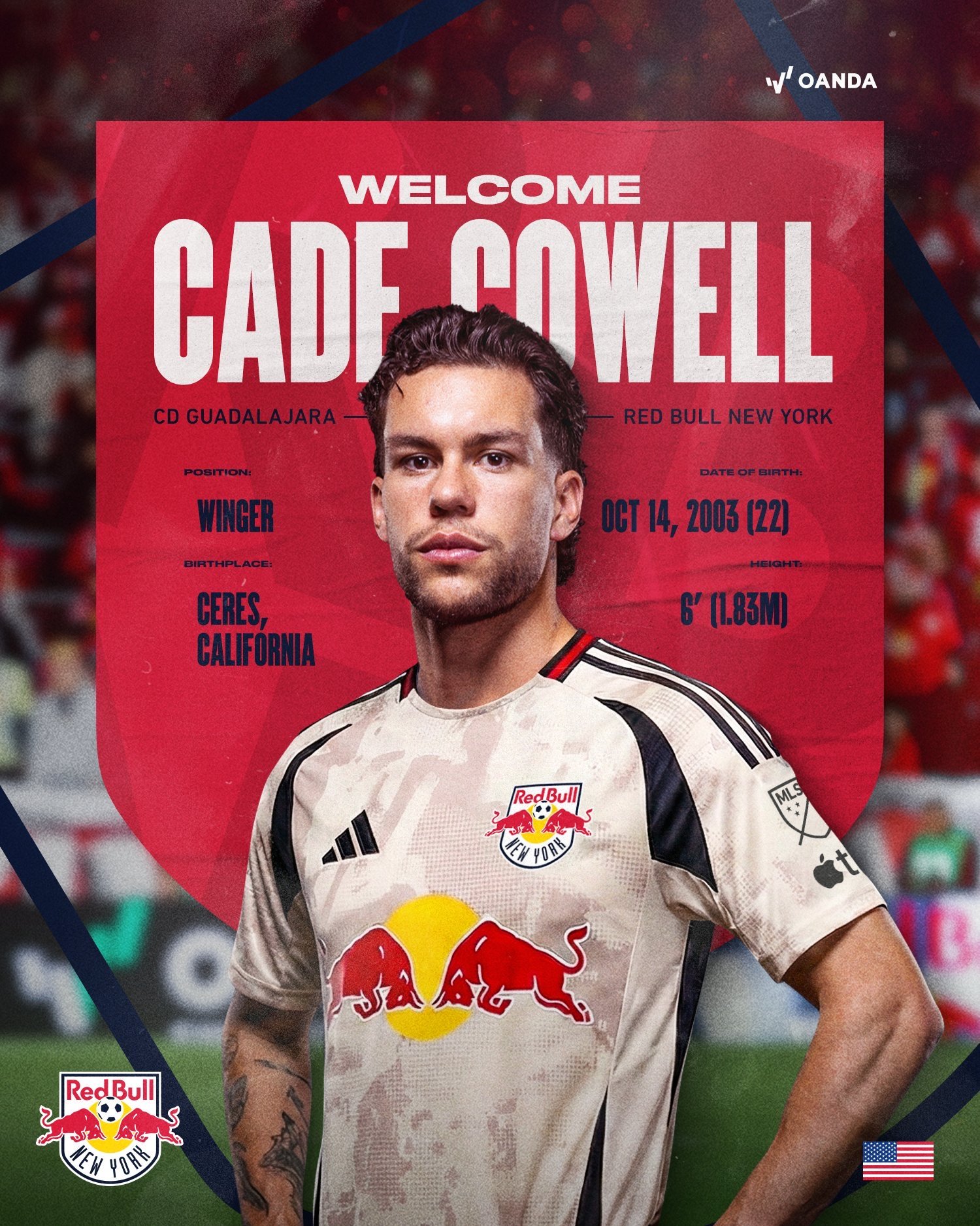 New York Red Bulls ha adquirido al extremo Cade Cowell a préstamo desde Chivas Guadalajara. El acuerdo será por un año, con opción de compra permanente al finalizar el préstamo, según anunció el club este jueves.