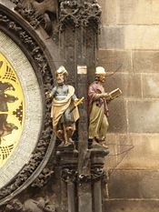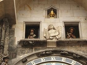 El calendario fue añadido al reloj en 1870. Los doce medallones representan los doce meses del año. Son obra del pintor checo Josef Mánes. Las cuatro esculturas laterales son de izquierda a derecha: