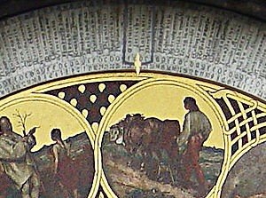 - El Sol: El sol dorado se mueve alrededor del círculo zodiacal, describiendo una elipse. El sol se junta con el brazo que tiene la mano dorada, y juntos nos muestran el tiempo de tres formas diferentes: