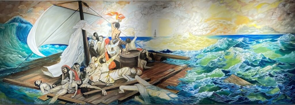 Gritos, desolación, remolinos negros, abismo de agua salada, la fragilidad humana frente a lo absoluto. La Balsa de la Medusa de Theodore Géricault representa una tragedia marítima que conmocionó a Francia, una desgracia naval, no exenta de poesía, los náufragos en una odisea por sobrevivir a una imprevista fatalidad, en un sálvese quien pueda, el hambre, el dolor, incluso el canibalismo, la resignación, como también la voluntad y la esperanza en ese punto de luz lejano en el horizonte.
